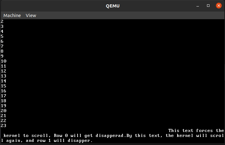 #include "../drivers/screen.h" void main() { clear_screen(); int i; for(i=0; i<24; i++) { char str[255]; int_to_ascii(i, str); kprint_at(str, 0, i); } kprint_at("This text forces the kernel to scroll, Row 0 will get disapperad.", 60, 24); kprint("By this text, the kernel will scroll again, and row 1 will disapper."); }