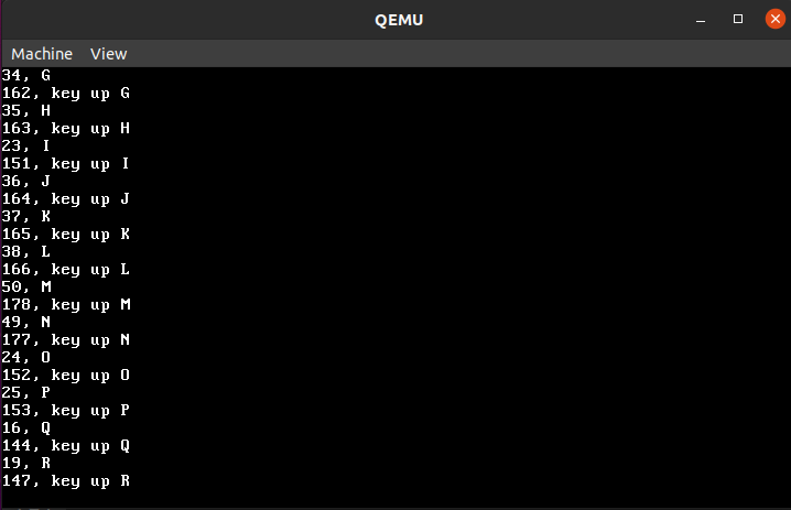 #include "keyboard.h" #include "ports.h" #include "../cpu/isr.h" #include "screen.h" static void keyboard_callback(registers_t regs) { // PIC가 scancode를 0x60 port에 저장 u8 scancode = port_byte_in(0x60); char *sc_ascii; int_to_ascii(scancode, sc_ascii); kprint(sc_ascii); kprint(", "); // scancode에 해당하는 문자 출력 print_letter(scancode); kprint("\n"); } void init_keyboard() { register_interrupt_handler(IRQ1, keyboard_callback); } void print_letter(u8 scancode) { switch(scancode) { case 0x0: kprint("ERROR"); break; case 0x1: kprint("ESC"); break; case 0x2: kprint("1"); break; case 0x3: kprint("2"); break; case 0x4: kprint("3"); break; case 0x5: kprint("4"); break; case 0x6: kprint("5"); break; case 0x7: kprint("6"); break; case 0x8: kprint("7"); break; case 0x9: kprint("8"); break; case 0x0A: kprint("9"); break; case 0x0B: kprint("0"); break; case 0x0C: kprint("-"); break; case 0x0D: kprint("+"); break; case 0x0E: kprint("Backspace"); break; case 0x0F: kprint("Tab"); break; case 0x10: kprint("Q"); break; case 0x11: kprint("W"); break; case 0x12: kprint("E"); break; case 0x13: kprint("R"); break; case 0x14: kprint("T"); break; case 0x15: kprint("Y"); break; case 0x16: kprint("U"); break; case 0x17: kprint("I"); break; case 0x18: kprint("O"); break; case 0x19: kprint("P"); break; case 0x1A: kprint("["); break; case 0x1B: kprint("]"); break; case 0x1C: kprint("ENTER"); break; case 0x1D: kprint("LCtrl"); break; case 0x1E: kprint("A"); break; case 0x1F: kprint("S"); break; case 0x20: kprint("D"); break; case 0x21: kprint("F"); break; case 0x22: kprint("G"); break; case 0x23: kprint("H"); break; case 0x24: kprint("J"); break; case 0x25: kprint("K"); break; case 0x26: kprint("L"); break; case 0x27: kprint(";"); break; case 0x28: kprint("'"); break; case 0x29: kprint("`"); break; case 0x2A: kprint("LShift"); break; case 0x2B: kprint("\\"); break; case 0x2C: kprint("Z"); break; case 0x2D: kprint("X"); break; case 0x2E: kprint("C"); break; case 0x2F: kprint("V"); break; case 0x30: kprint("B"); break; case 0x31: kprint("N"); break; case 0x32: kprint("M"); break; case 0x33: kprint(","); break; case 0x34: kprint("."); break; case 0x35: kprint("/"); break; case 0x36: kprint("Rshift"); break; case 0x37: kprint("Keypad *"); break; case 0x38: kprint("LAlt"); break; case 0x39: kprint("Spc"); break; default: // Keyup은 Keydown+0x80 if(scancode<=0x7f) { kprint("Unknown key down"); } else if(0x80<=scancode && scancode<=0x39+0x80) { kprint("key up "); print_letter(scancode-0x80); } else { kprint("Unknown key up"); } break; } }kernels/kernel.c