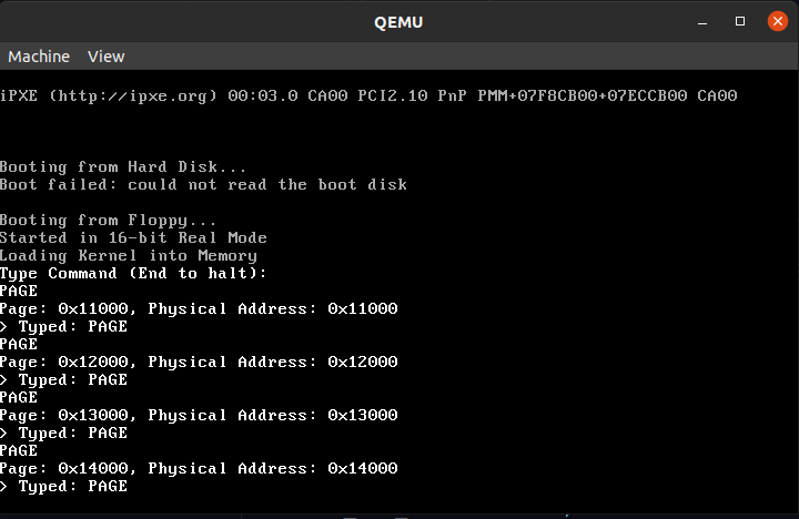 void user_input(char *input) { if(strcmp(input, "END")==0) { kprint("Stop System...\n"); // hlt: halt CPU asm volatile("hlt"); } else if(strcmp(input, "PAGE")==0) { u32 phys_addr; u32 page = kmalloc(1000, 1, &phys_addr); char page_str[16] = ""; hex_to_ascii(page, page_str); char phys_str[16] = ""; hex_to_ascii(phys_addr, phys_str); kprint("Page: "); kprint(page_str); kprint(", Physical Address: "); kprint(phys_str); kprint("\n"); } kprint("> Typed: "); kprint(input); kprint("\n"); }