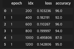 pd_results = [] for epoch in range(epochs): for i, (images, labels) in enumerate(train_loader): out = net(images) loss = criterion(out, labels-1) optimizer.zero_grad() loss.backward() optimizer.step() total = labels.size(0) preds = torch.max(out.data, 1)[1] correct = (preds==labels-1).sum().item() if (i+1)%200==0: results = OrderedDict() results['epoch'] = epoch+1 results['idx'] = i+1 results['loss'] = loss.item() results['accuracy'] = 100.*correct/total pd_results.append(results) df = pd.DataFrame.from_dict(pd_results, orient='columns') clear_output(wait=True) display(df)학습을 시작합니다. 위와 같이 중간중간 프로세스를 Pandas를 이용해 출력합니다.